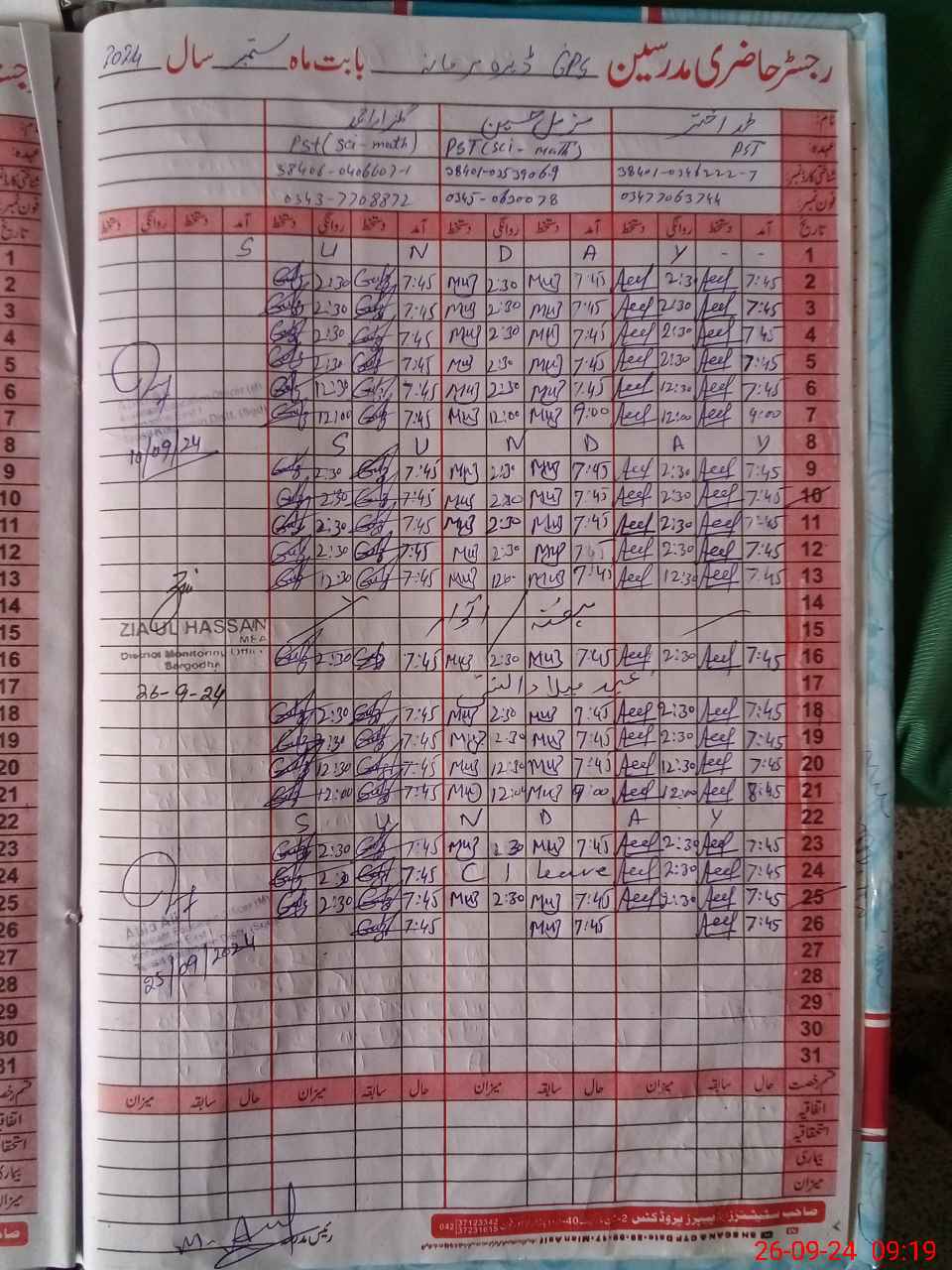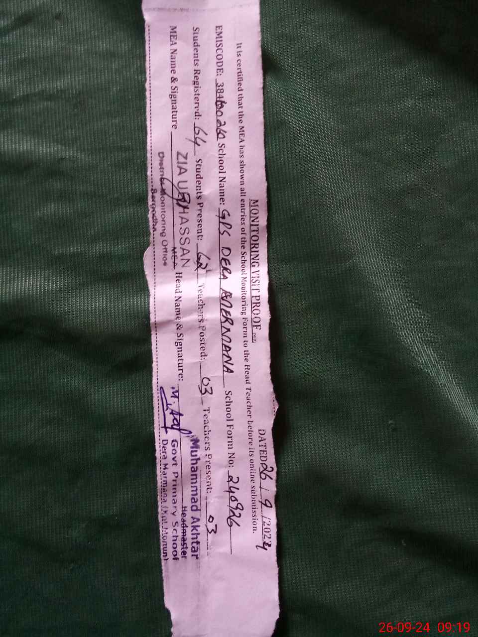 | Monitoring Date: 26-09-2024 | Start Time: 26-09-2024 08:43 AM | End Time: 26-09-2024 09:20 AM | Name of MEA: ZI**** ULHA**** | |