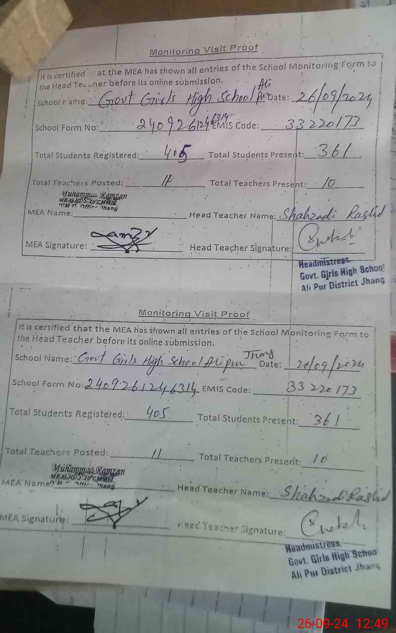 | EMIS Code: 33220173 | Name of School: GGHS ALI PUR | |||