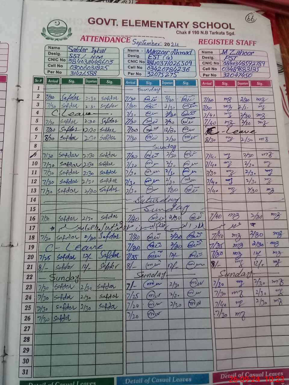 | CNIC | Full Name | Designation | R/C | Absence during last cal. month |