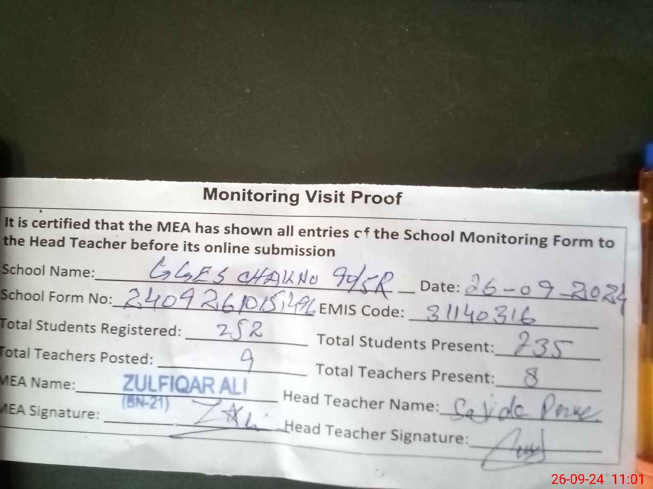 | Certified that this School was Inspected by the Undersigned MEA/DMO Today and the Information Stated Above is as Per Record. | |||||