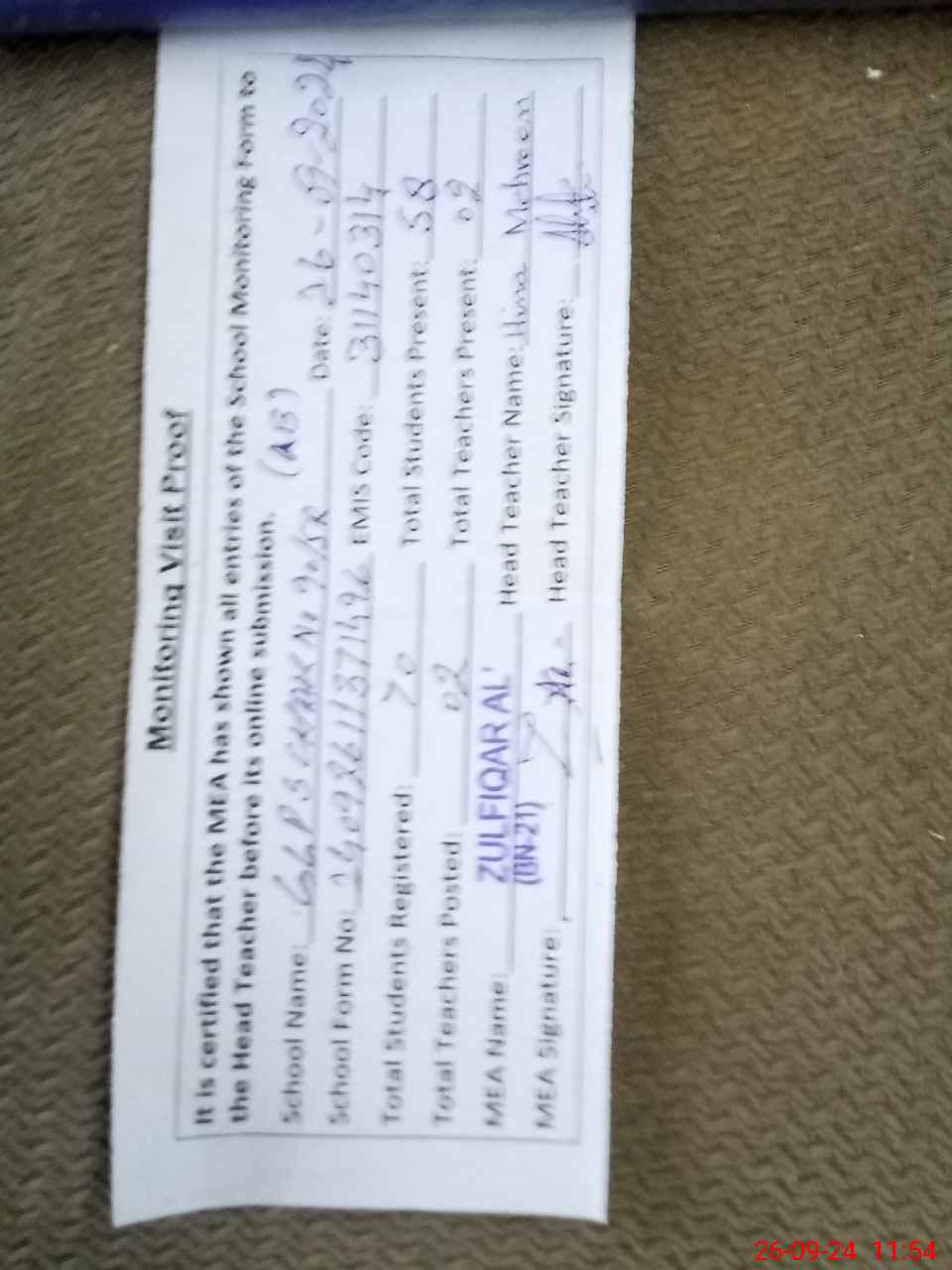 | Attendance Register | Head Teacher | MEA with School | Visit Proof |