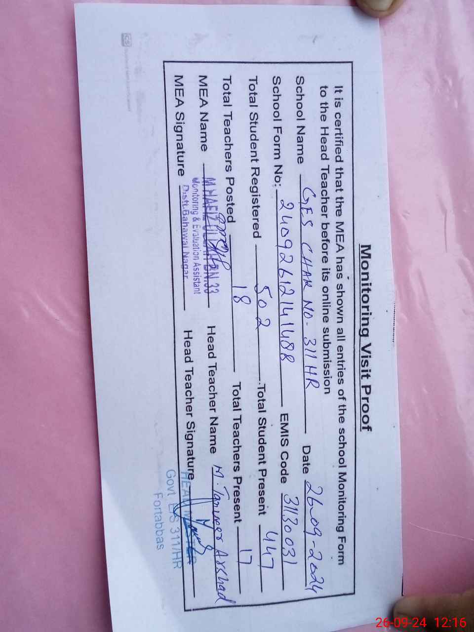 | Attendance Register | Head Teacher | MEA with School | Visit Proof |