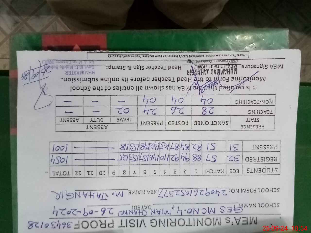 | Monitoring Date: 26-09-2024 | Start Time: 26-09-2024 09:24 AM | End Time: 26-09-2024 11:07 AM | Name of MEA: Mu**** Ja**** | |