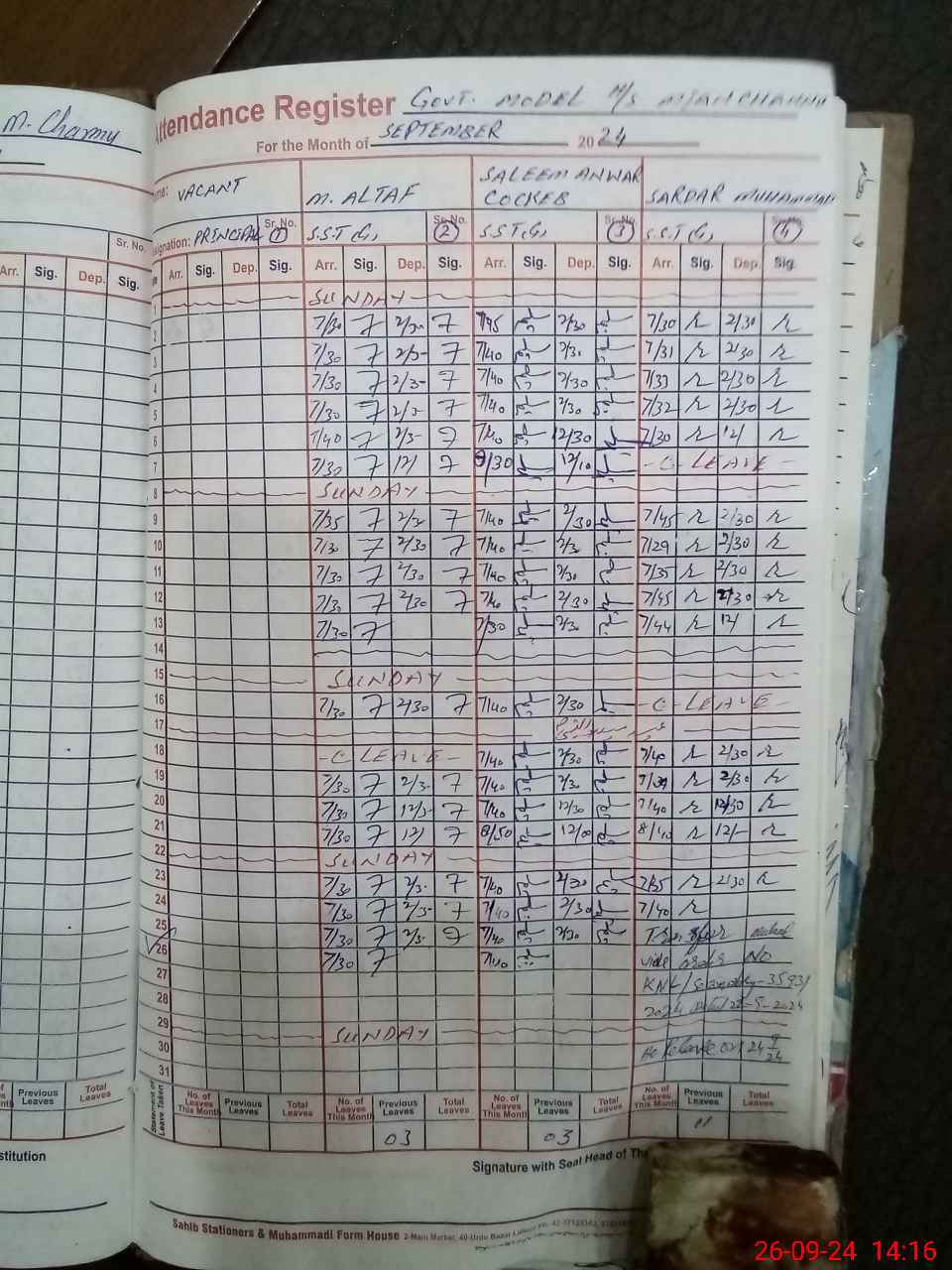 | Leave | Duty | Absent | Maternity | Medical | Ex- Pak |