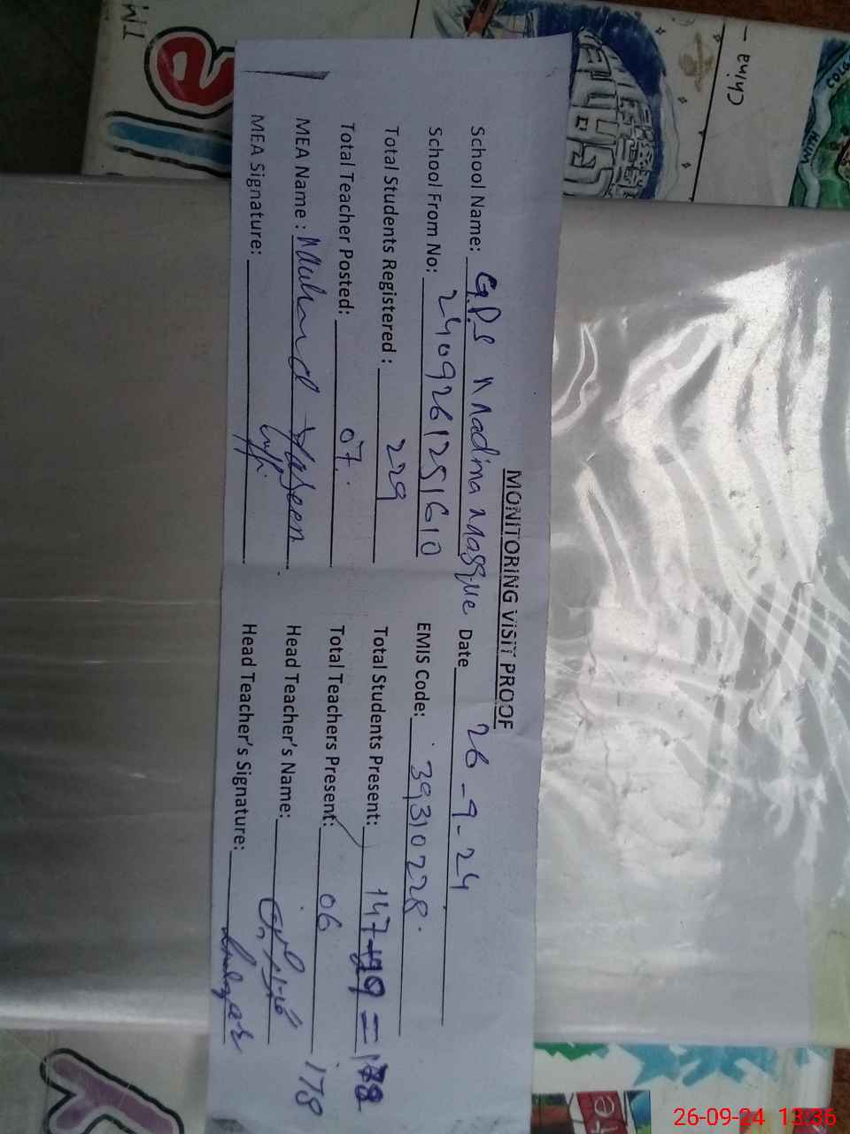 | Attendance Register | Head Teacher | MEA with School | Visit Proof |