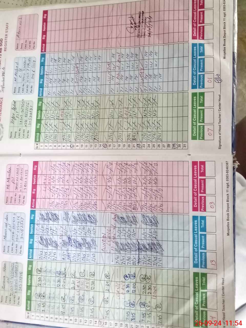 | CNIC | Full Name | Designation | R/C | Absence during last cal. month |
