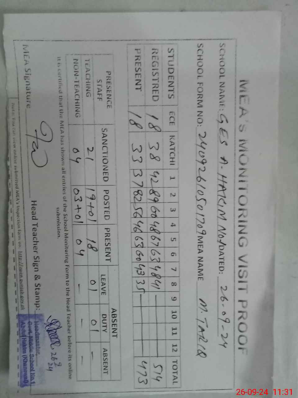 | Attendance Register | Head Teacher | MEA with School | Visit Proof |