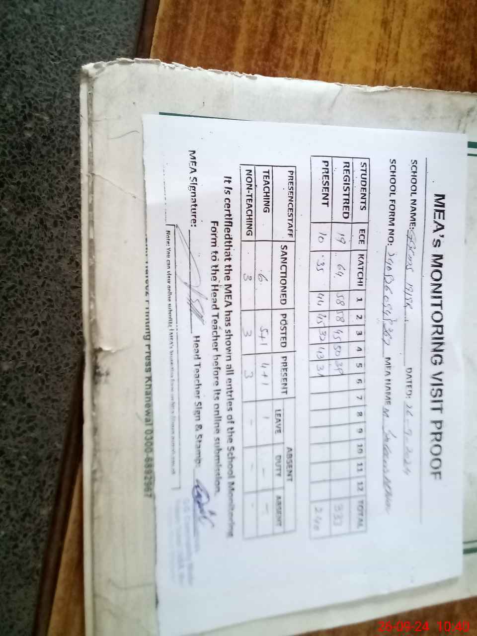 | Attendance Register | Head Teacher | MEA with School | Visit Proof |