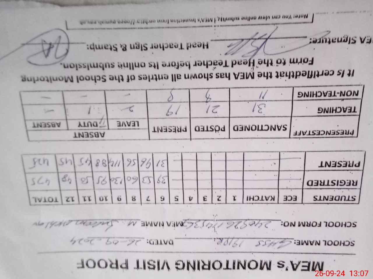 | Attendance Register | Head Teacher | MEA with School | Visit Proof |