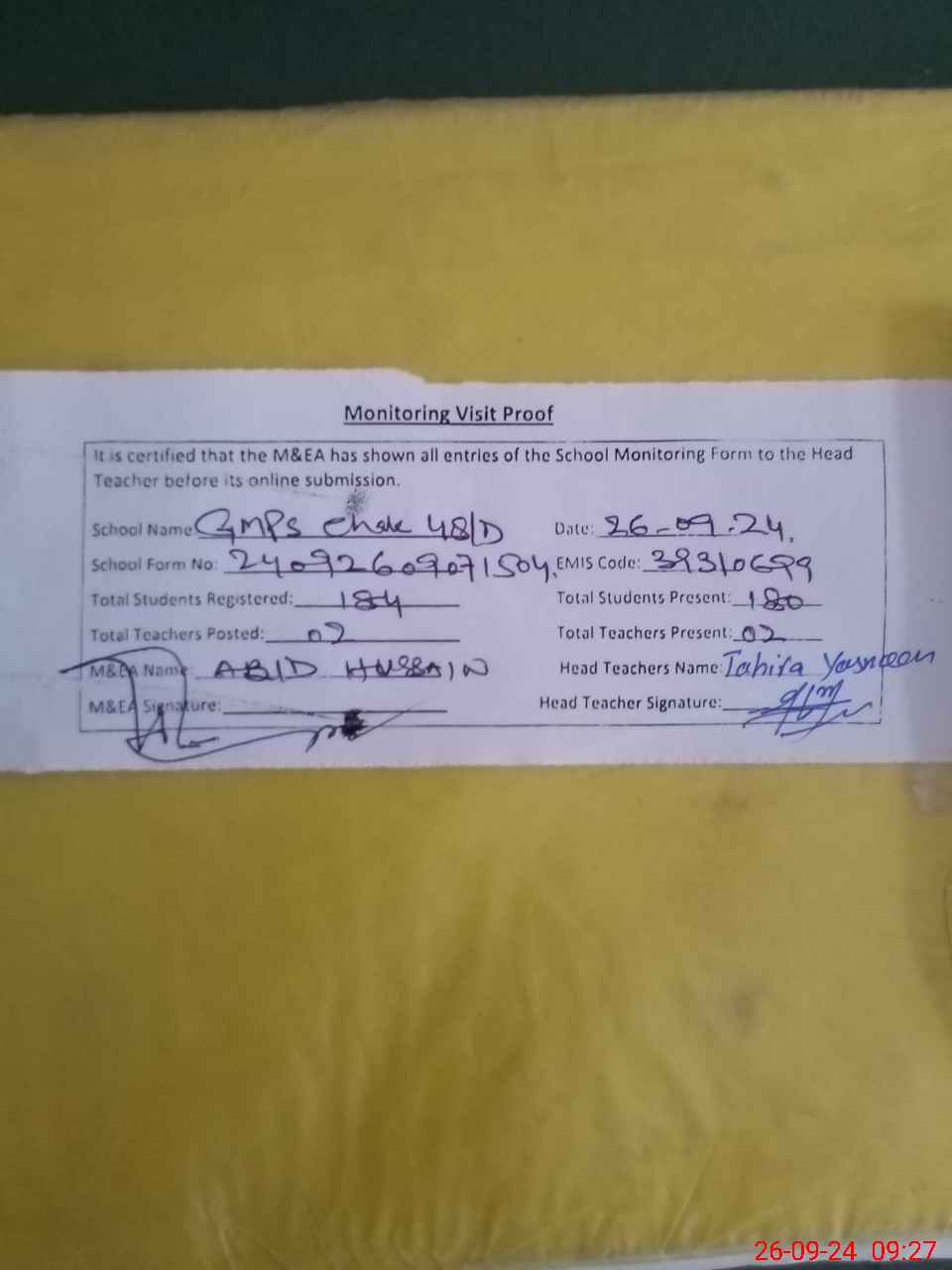 | Attendance Register | Head Teacher | MEA with School | Visit Proof |