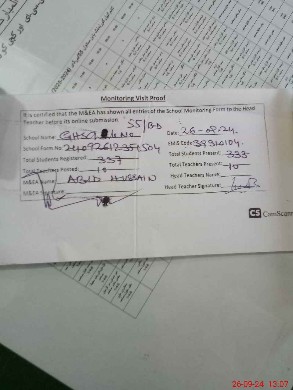 | Attendance Register | Head Teacher | MEA with School | Visit Proof |