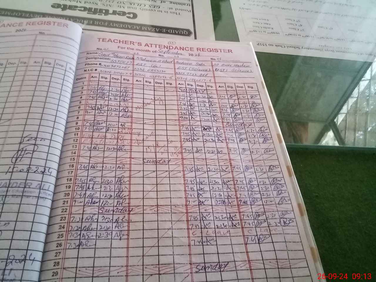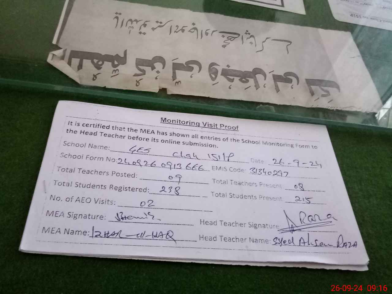 | Monitoring Date: 26-09-2024 | Start Time: 26-09-2024 08:57 AM | End Time: 26-09-2024 09:24 AM | Name of MEA: Mu**** Iz**** UlHa**** | |