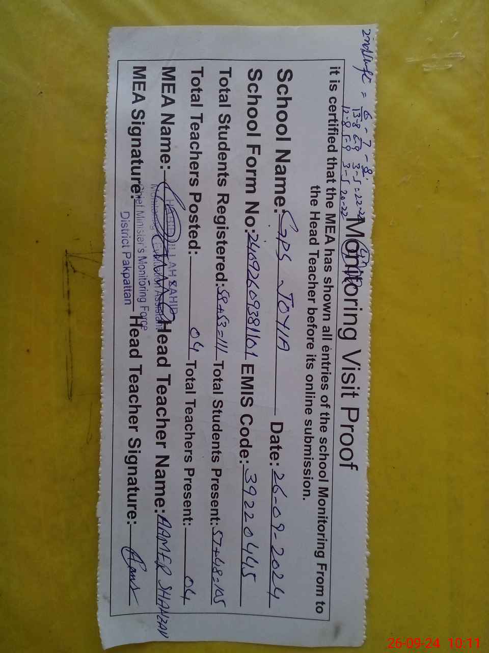 | EMIS Code: 39220445 | Name of School: GPS JOYIA P.O NOORA PATH ARIF WALA | |||