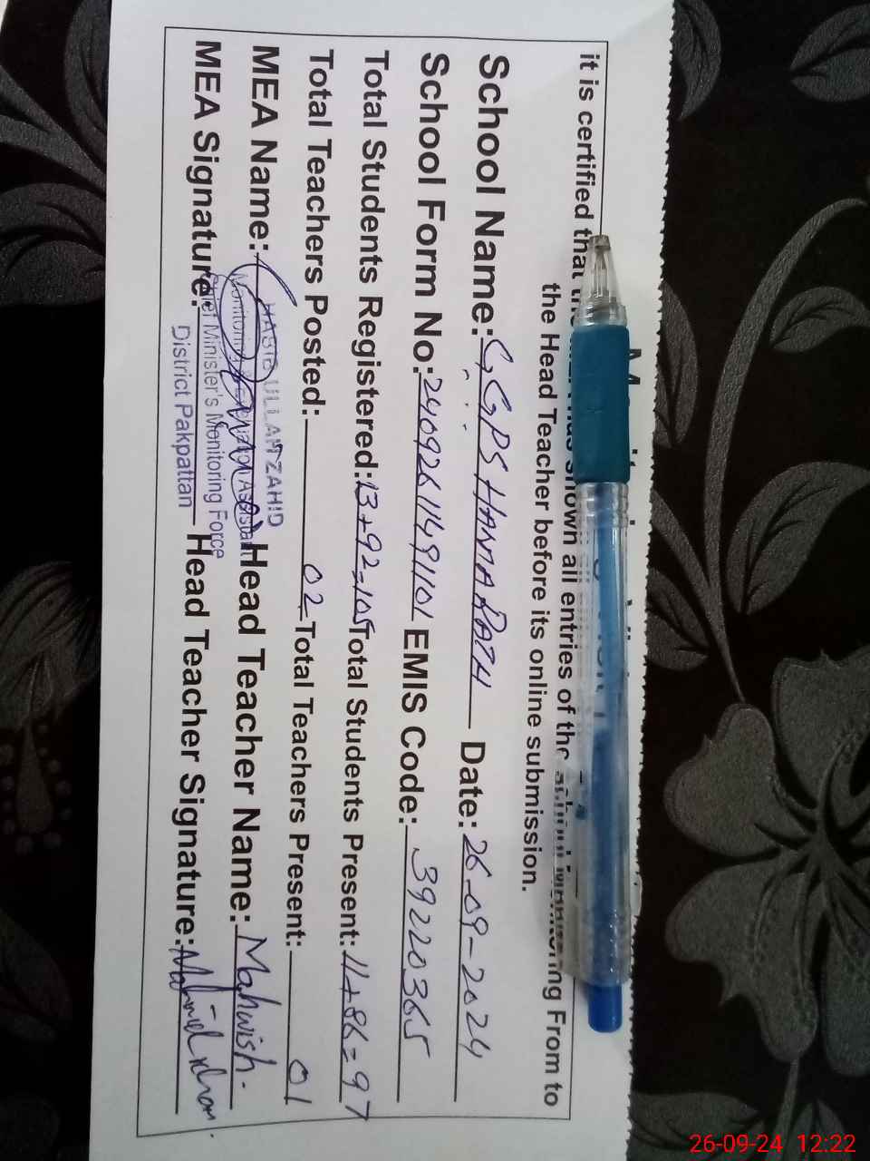| Name: SU**** FA**** Designation: (School Headmaster's/Headmistress's) PST Phone/Cell Number: 03**** |