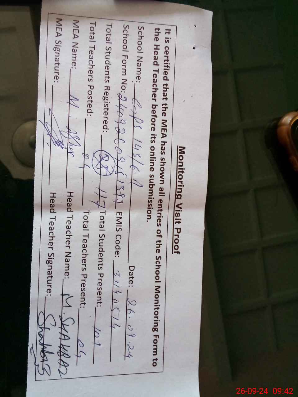 | Attendance Register | Head Teacher | MEA with School | Visit Proof |