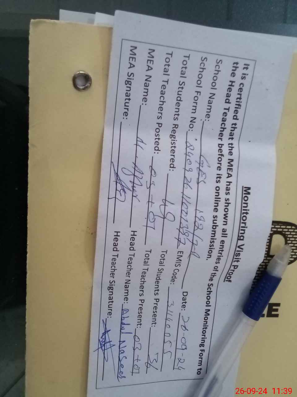 | Remarks (Use Separate Page if Required): Hafiz Muhammad Naeem Raza posted here and he is present but his name is not in tab list and AEO not visited the school last month and Free Text books record not shown to mea and students attendance register are not updated and NSB RECORD NOT SHOWN TO MEA | |||||