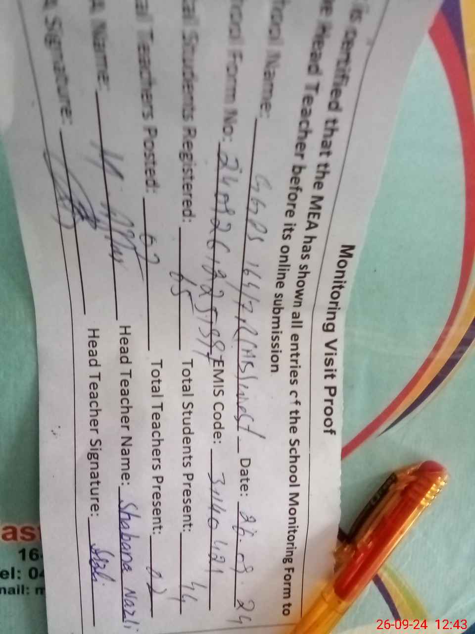 | Attendance Register | Head Teacher | MEA with School | Visit Proof |