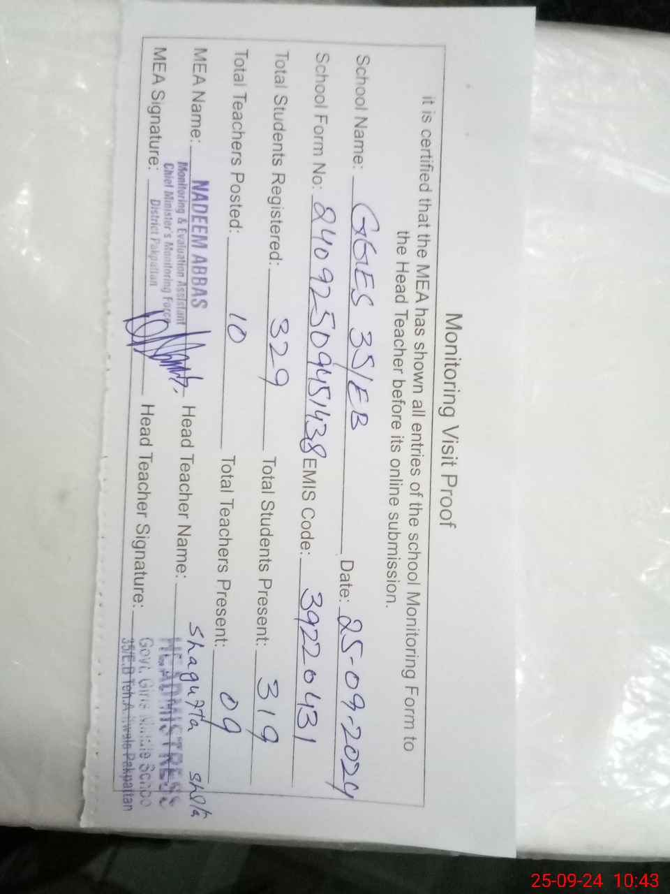| Certified that this School was Inspected by the Undersigned MEA/DMO Today and the Information Stated Above is as Per Record. | |||||