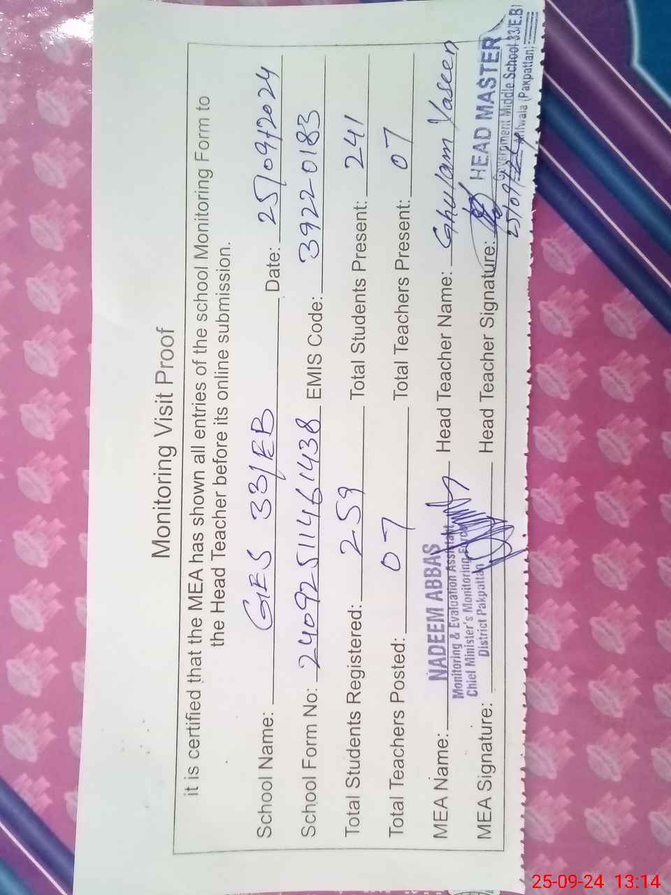 | Certified that this School was Inspected by the Undersigned MEA/DMO Today and the Information Stated Above is as Per Record. | |||||