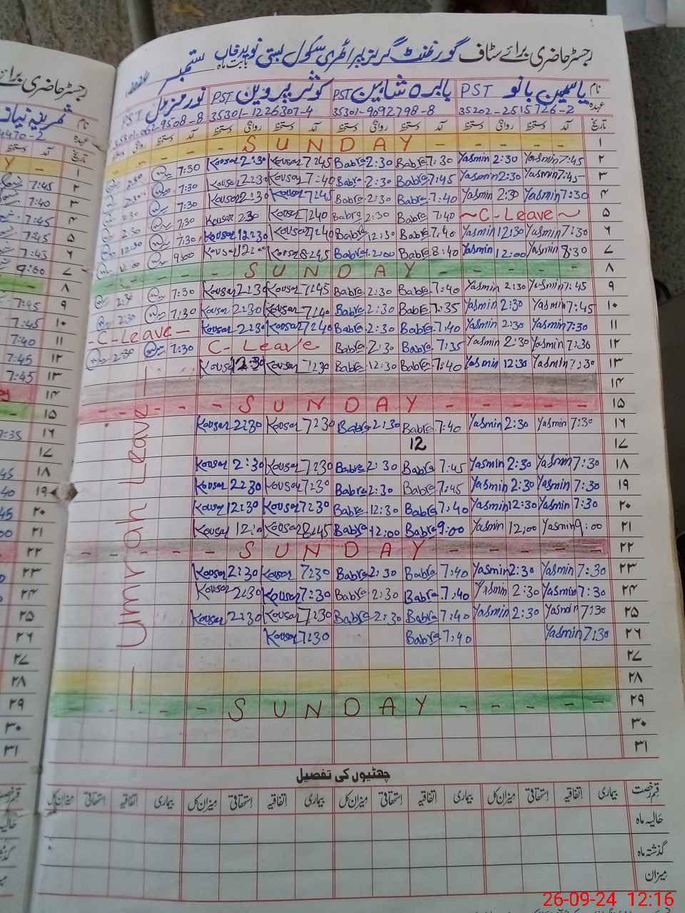 | Leave | Duty | Absent | Maternity | Medical | Ex- Pak |