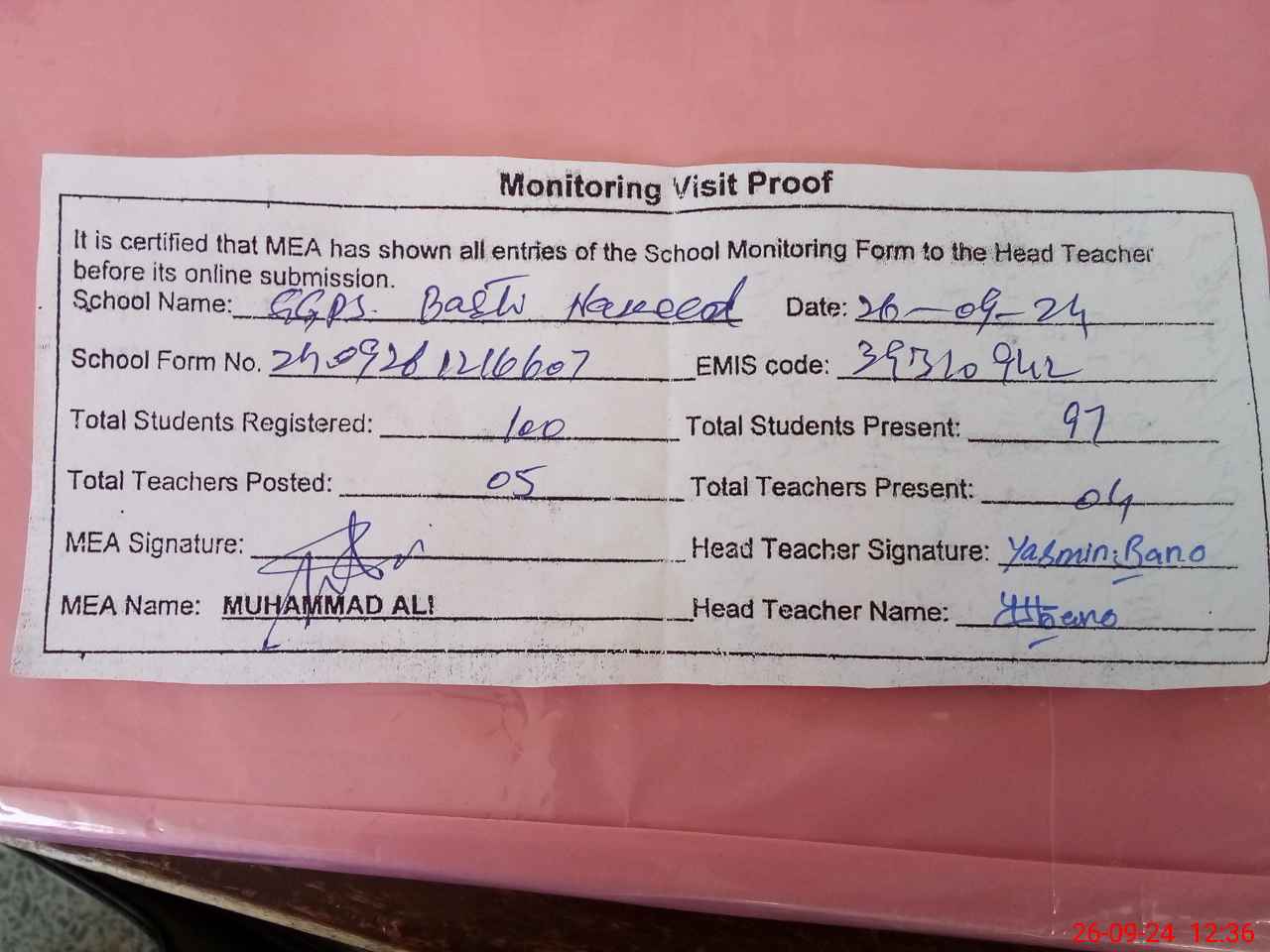 | Attendance Register | Head Teacher | MEA with School | Visit Proof |