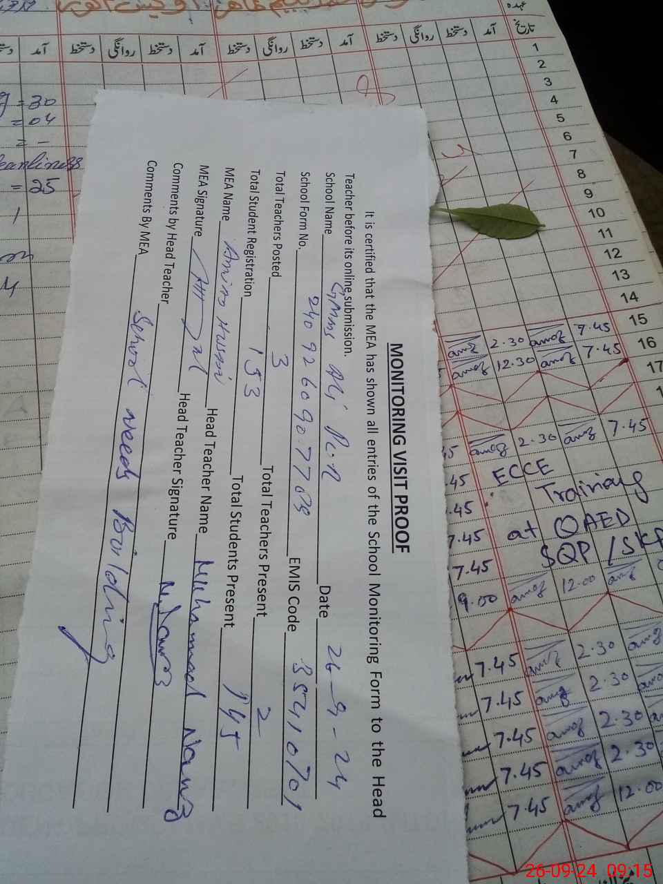 | Attendance Register | Head Teacher | MEA with School | Visit Proof |