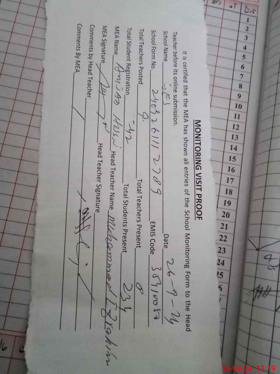 | Attendance Register | Head Teacher | MEA with School | Visit Proof |