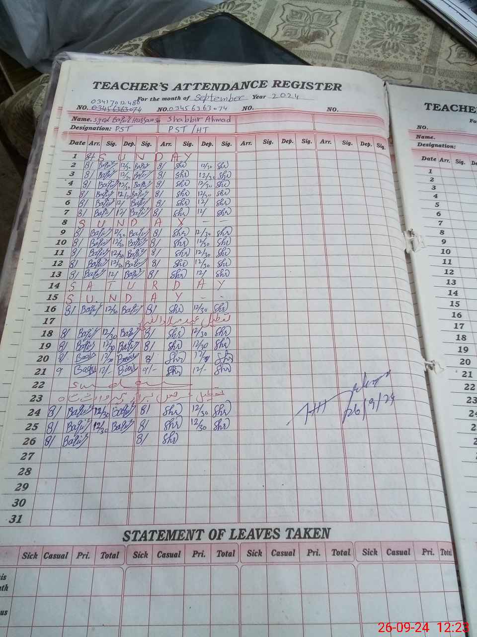 | Name: SH**** AH**** Designation: (School Headmaster's/Headmistress's) PST Phone/Cell Number: 03**** |