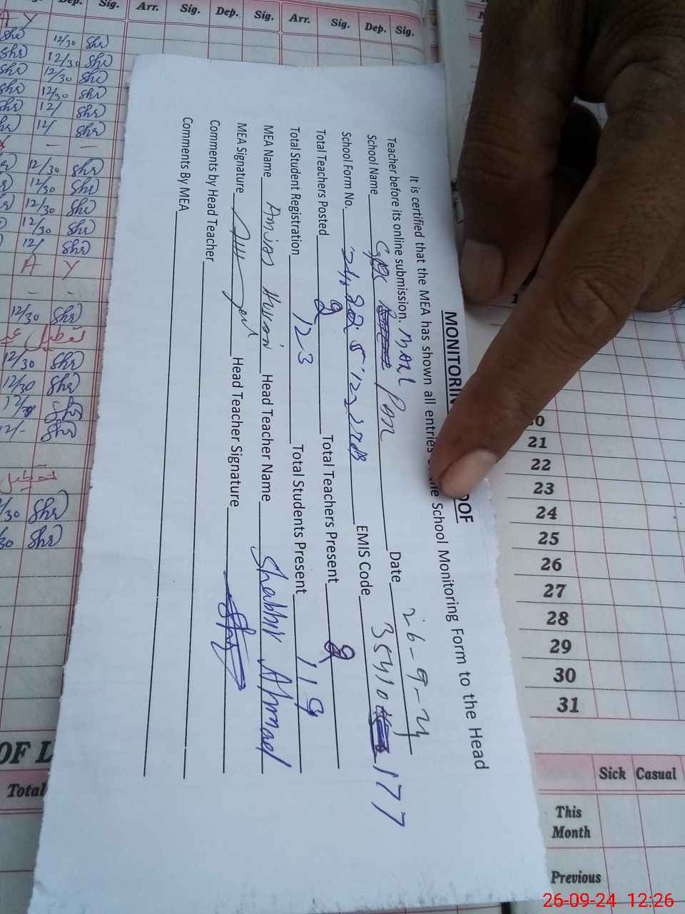 | Attendance Register | Head Teacher | MEA with School | Visit Proof |