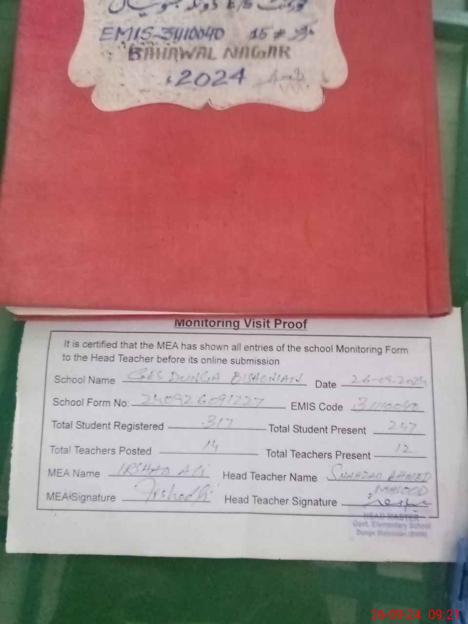 | Attendance Register | Head Teacher | MEA with School | Visit Proof |