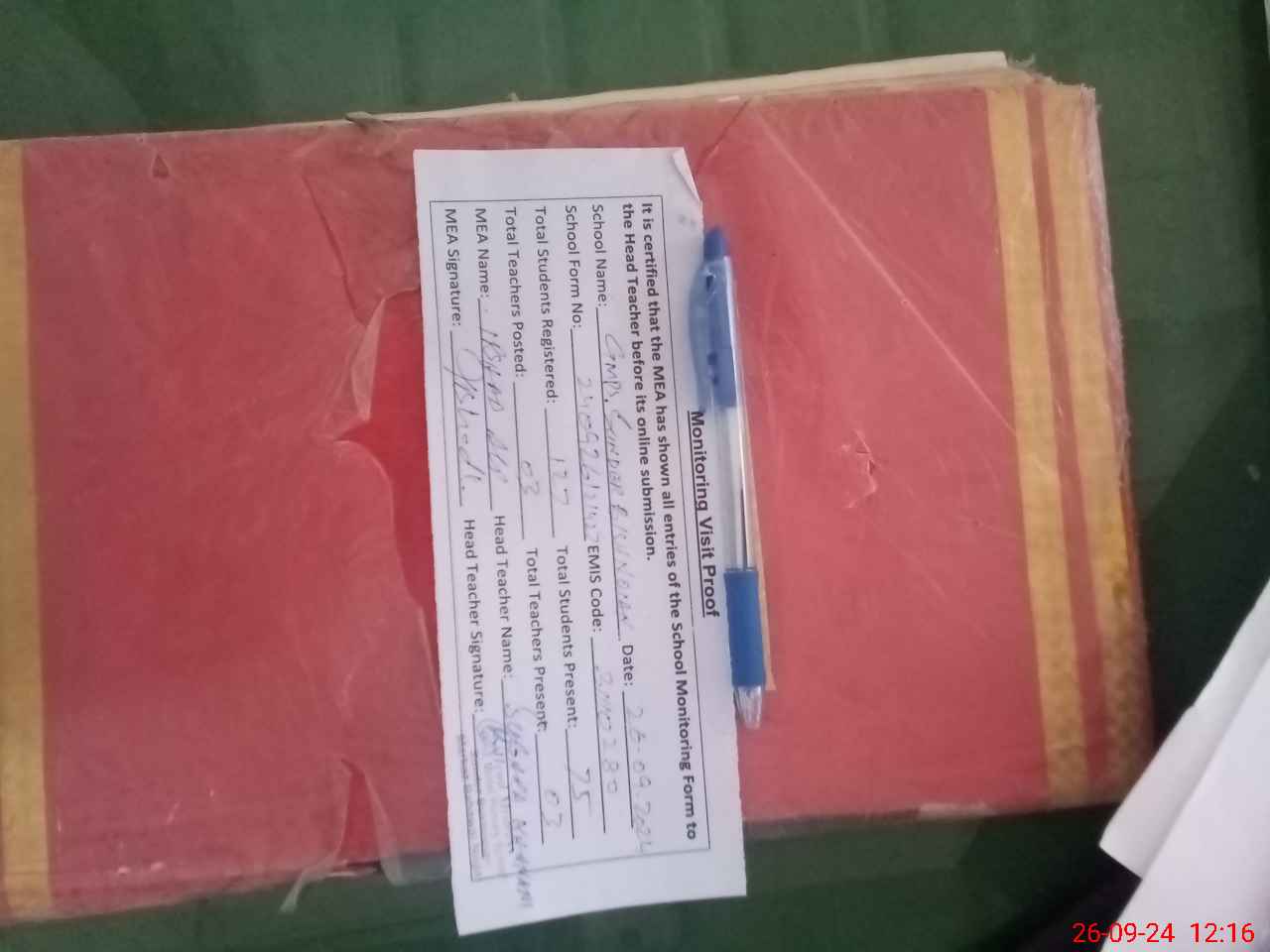 | Attendance Register | Head Teacher | MEA with School | Visit Proof |