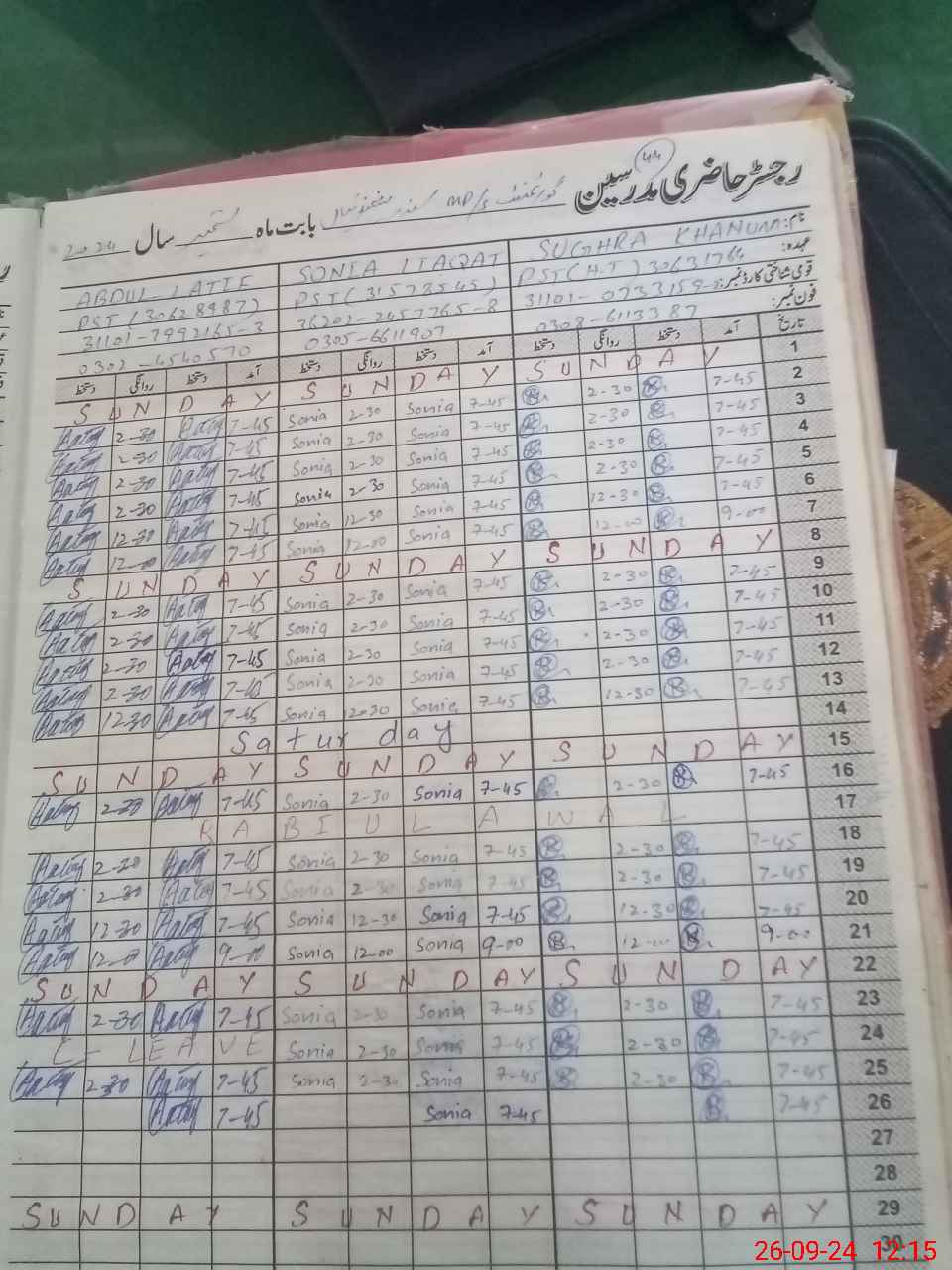 | CNIC | Full Name | Designation | R/C | Absence During Last Calender Month |