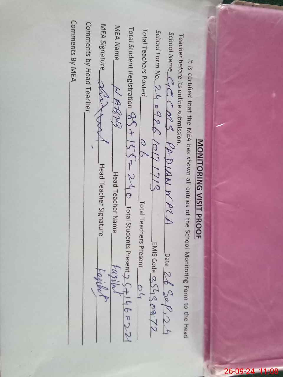 | Attendance Register | Head Teacher | MEA with School | Visit Proof |