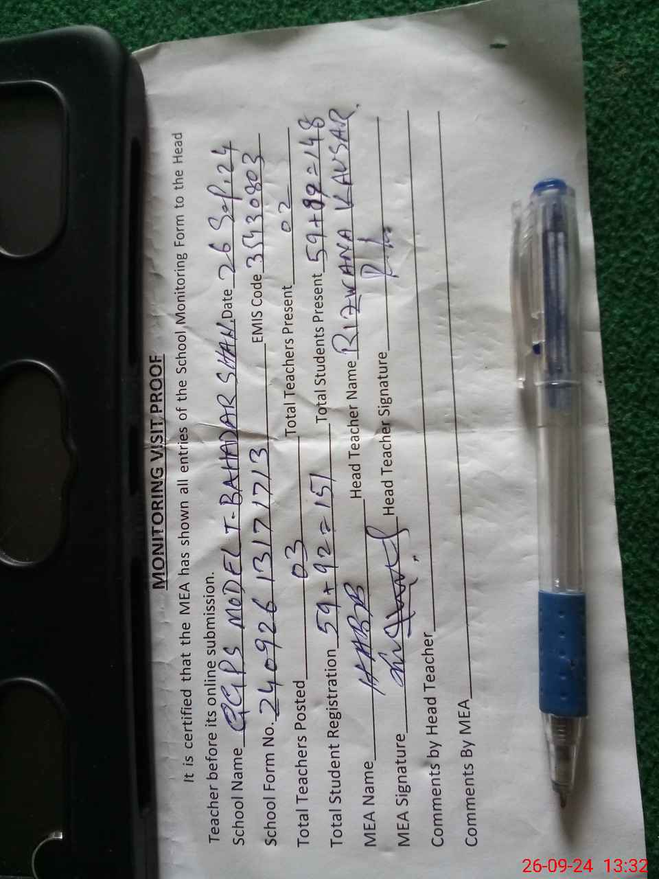| Name: SA**** AZ**** Designation: (School Headmaster's/Headmistress's) PST Phone/Cell Number: 03**** |