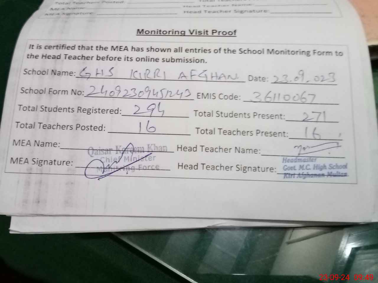 | Attendance Register | Head Teacher | MEA with School | Visit Proof |