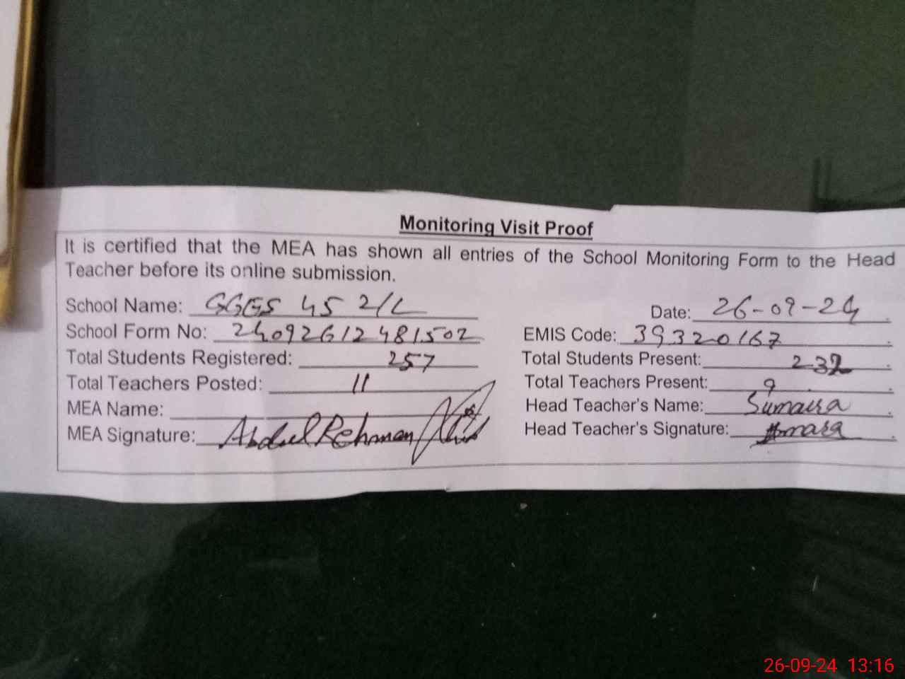 | Attendance Register | Head Teacher | MEA with School | Visit Proof |
