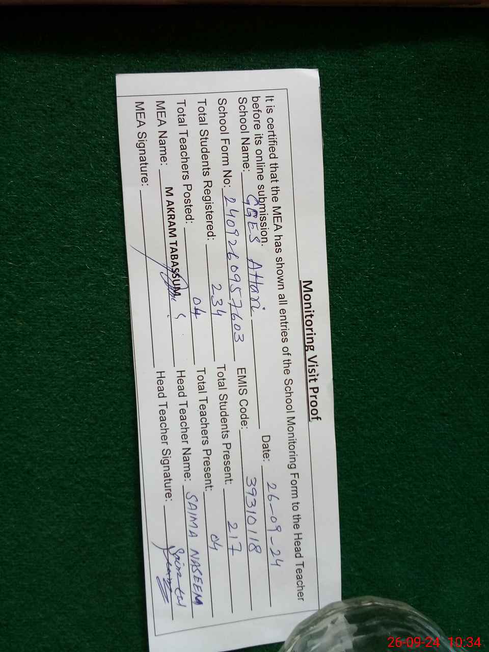 | Attendance Register | Head Teacher | MEA with School | Visit Proof |