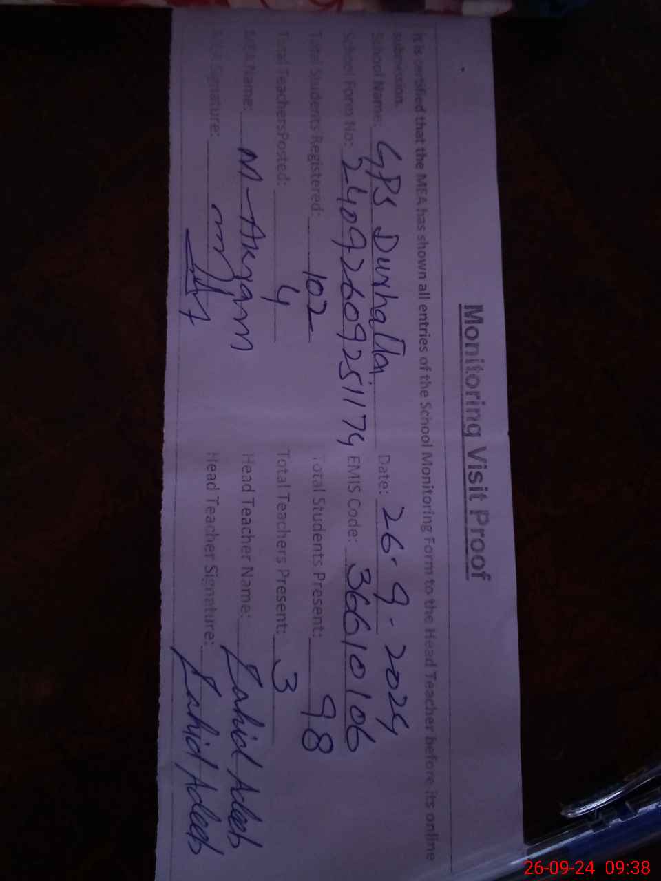 | Attendance Register | Head Teacher | MEA with School | Visit Proof |