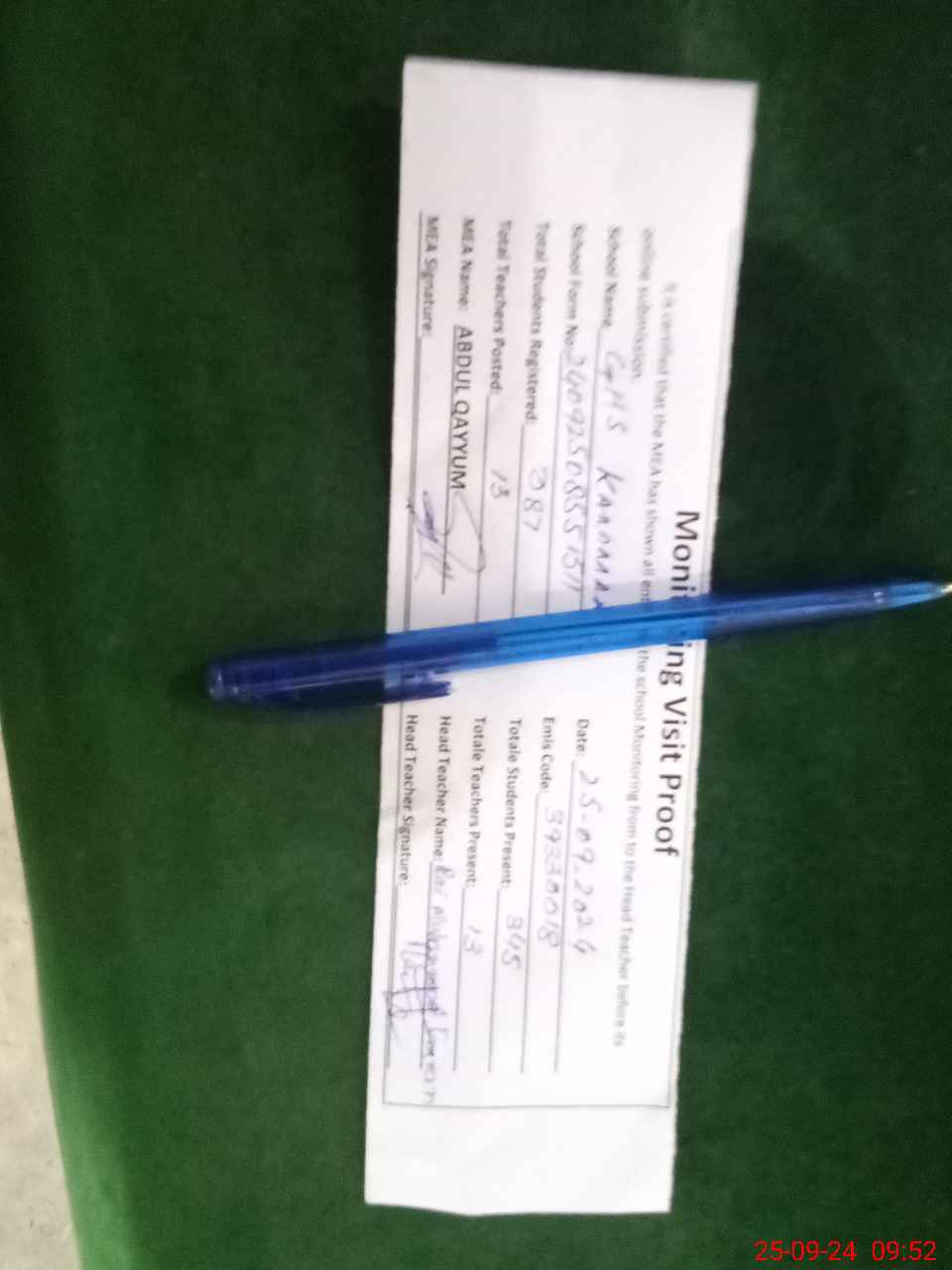 | Attendance Register | Head Teacher | MEA with School | Visit Proof |