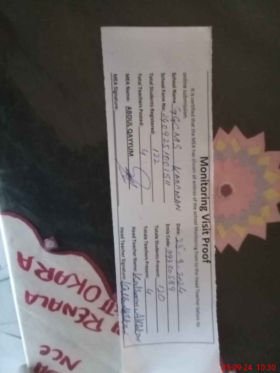 | Certified that this School was Inspected by the Undersigned MEA/DMO Today and the Information Stated Above is as Per Record. | |||||
