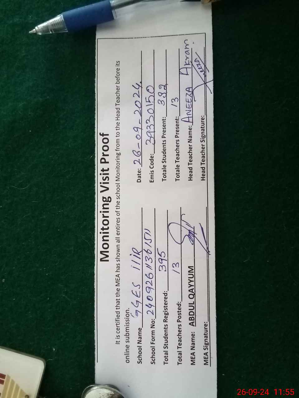 | Attendance Register | Head Teacher | MEA with School | Visit Proof |