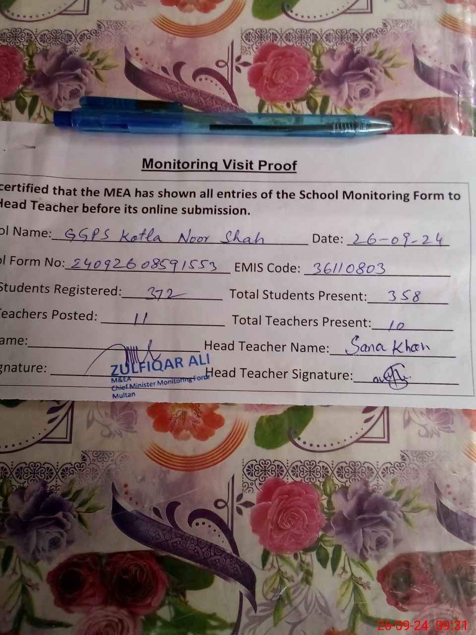 | Monitoring Date: 26-09-2024 | Start Time: 26-09-2024 08:59 AM | End Time: 26-09-2024 09:34 AM | Name of MEA: Zu**** Al**** | |