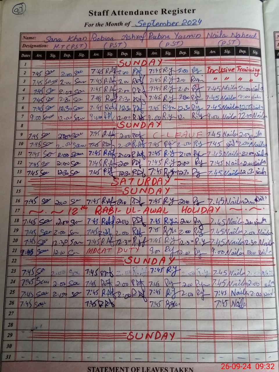 | Leave | Duty | Absent | Maternity | Medical | Ex- Pak |
