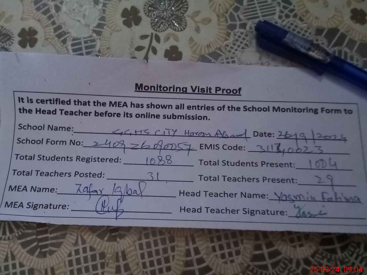 | Monitoring Date: 26-09-2024 | Start Time: 26-09-2024 08:24 AM | End Time: 26-09-2024 09:10 AM | Name of MEA: Za**** Iq**** BN**** | |