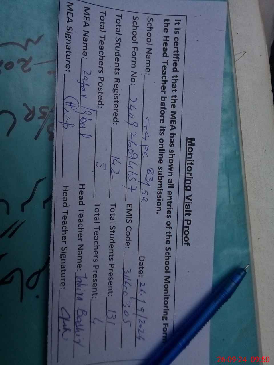 | Attendance Register | Head Teacher | MEA with School | Visit Proof |