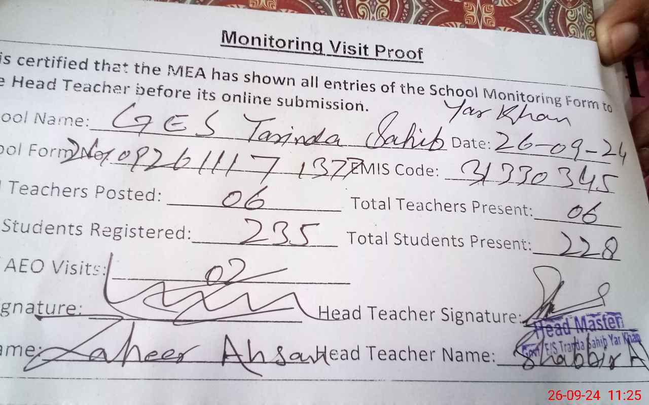 | Attendance Register | Head Teacher | MEA with School | Visit Proof |