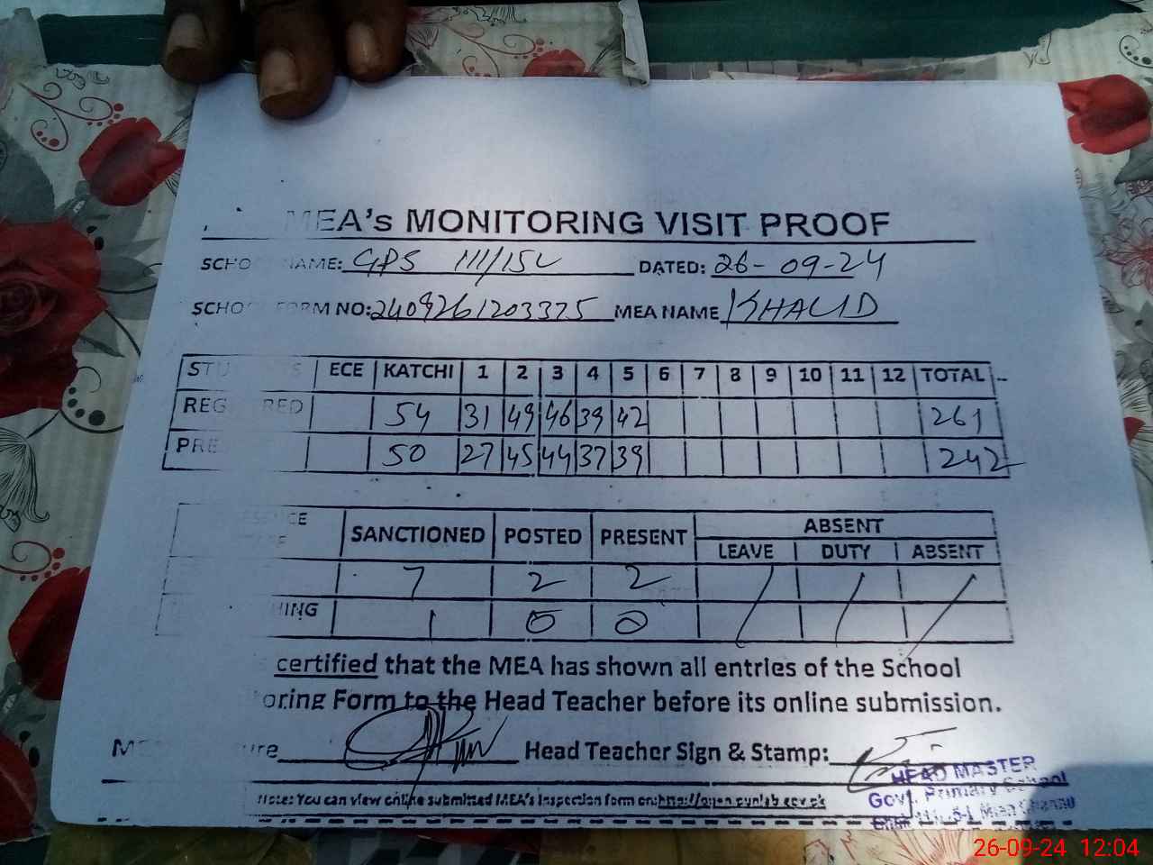 | Monitoring Date: 26-09-2024 | Start Time: 26-09-2024 11:20 AM | End Time: 26-09-2024 12:25 PM | Name of MEA: Kh**** Me**** | |