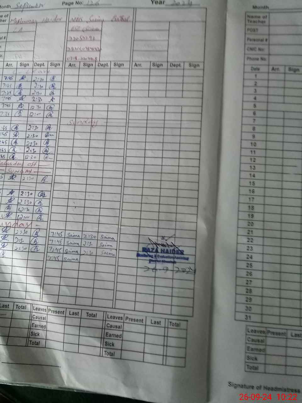 | Name: As**** Ba**** Designation: (School Headmaster's/Headmistress's) S.S.T.(Sci ) Phone/Cell Number: 03**** |