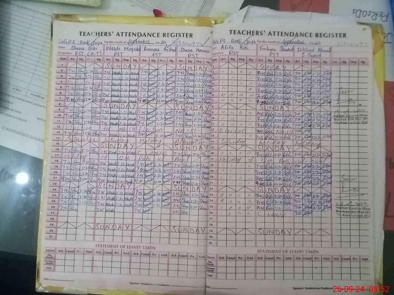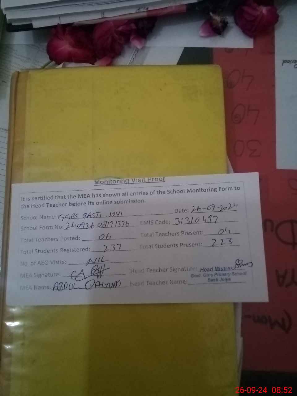 | Attendance Register | Head Teacher | MEA with School | Visit Proof |