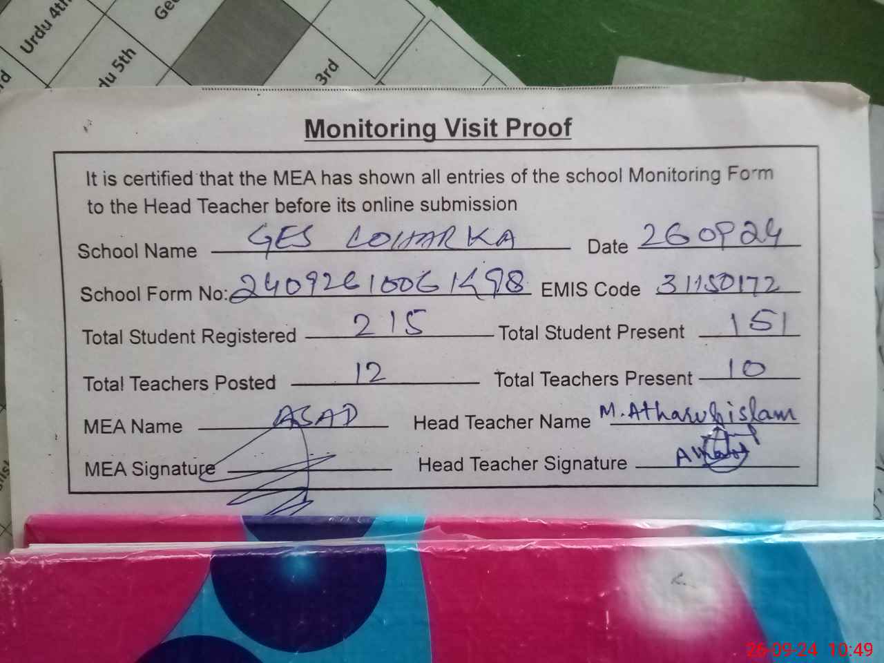 | Attendance Register | Head Teacher | MEA with School | Visit Proof |